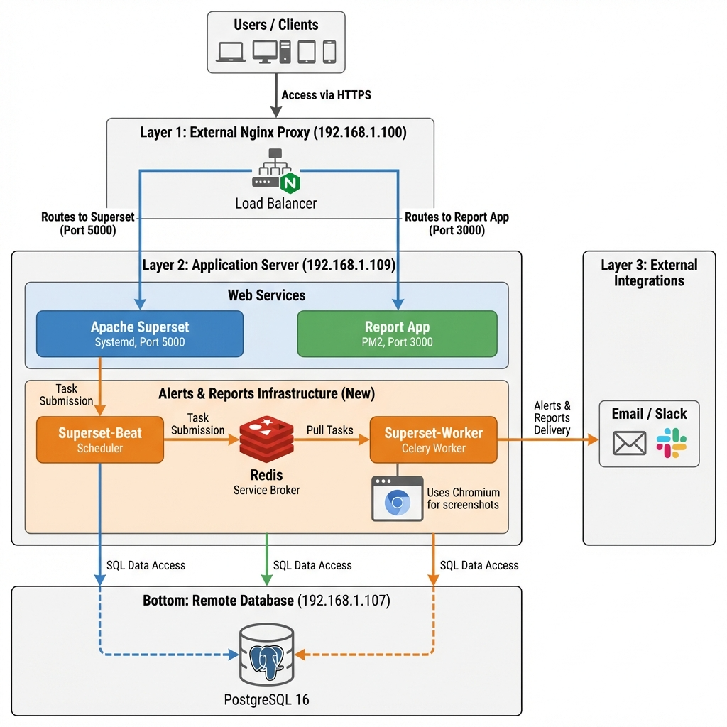 本構成図は、Apache Supersetを中心とした統合システムに、新しく実装された 「タイマー配信機能(Alerts & Reports)」 のインフラ構成を追加したものです。
